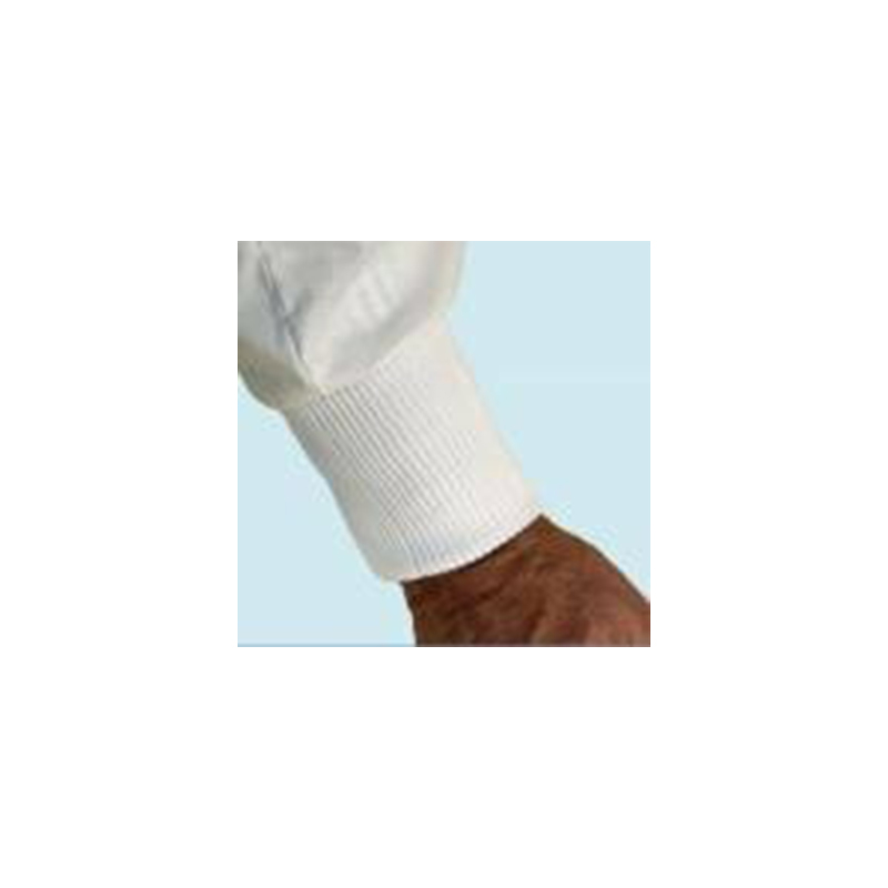 Les poignets, terminés par un bord-côtes en tissu blanc élastique d’une largeur de 7cm, permet la mise en place facilitée et le port de gants de protection, et si nécessaire, d’une manchette de protection. L’élasticité modérée du bord-côtes évite une compression du poignet assurant ainsi le confort.